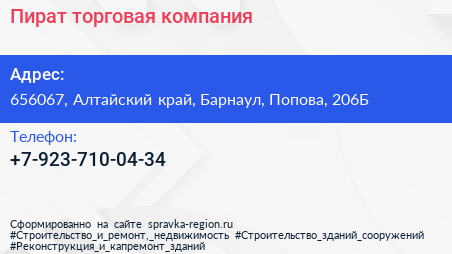 Пират, торговая компания по адресу 656067, Алтайский край, Барнаул, Попова, 206Б в дальнейшем Организация, размещена в следующих категориях: