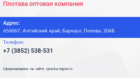 Плотава, оптовая компания по адресу 656067, Алтайский край, Барнаул, Попова, 206Б в дальнейшем Организация, размещена в следующих категориях: