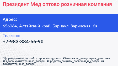 Президент Мед, оптово-розничная компания по адресу 656064, Алтайский край, Барнаул, Заринская, 6а в дальнейшем Организация, размещена в следующих категориях: