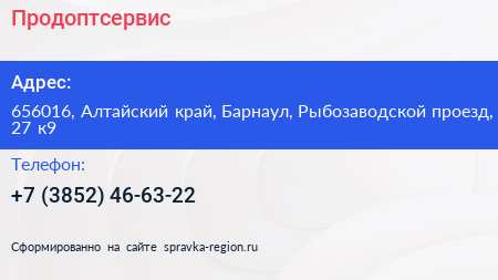 Продоптсервис по адресу 656016, Алтайский край, Барнаул, Рыбозаводской проезд, 27 к9 в дальнейшем Организация, размещена в следующих категориях: