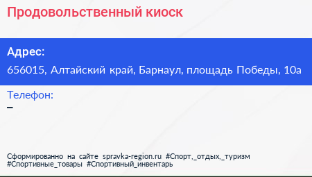 Продовольственный киоск по адресу 656015, Алтайский край, Барнаул, площадь Победы, 10а в дальнейшем Организация, размещена в следующих категориях: