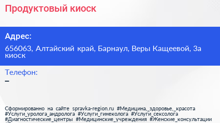 Продуктовый киоск по адресу 656063, Алтайский край, Барнаул, Веры Кащеевой, 3а киоск в дальнейшем Организация, размещена в следующих категориях:
