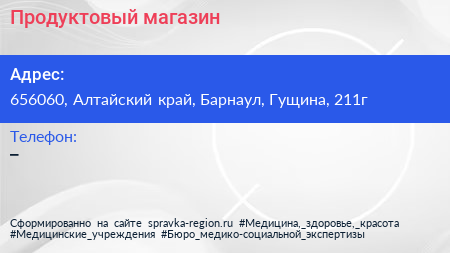 Продуктовый магазин по адресу 656060, Алтайский край, Барнаул, Гущина, 211г в дальнейшем Организация, размещена в следующих категориях: