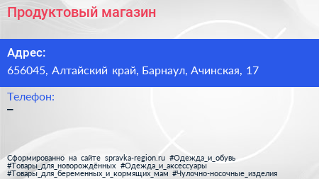 Продуктовый магазин по адресу 656045, Алтайский край, Барнаул, Ачинская, 17 в дальнейшем Организация, размещена в следующих категориях: