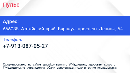 Пульс по адресу 656038, Алтайский край, Барнаул, проспект Ленина, 54 в дальнейшем Организация, размещена в следующих категориях: