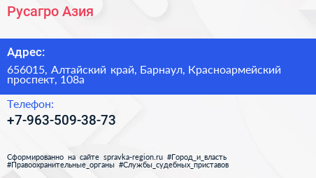 Русагро-Азия по адресу 656015, Алтайский край, Барнаул, Красноармейский проспект, 108а в дальнейшем Организация, размещена в следующих категориях: