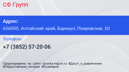 СФ Групп по адресу 656050, Алтайский край, Барнаул, Покровская, 10 в дальнейшем Организация, размещена в следующих категориях: