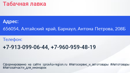 Табачная лавка по адресу 656054, Алтайский край, Барнаул, Антона Петрова, 208Б в дальнейшем Организация, размещена в следующих категориях: