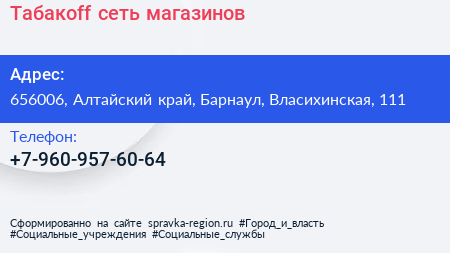 Табакоff, сеть магазинов по адресу 656006, Алтайский край, Барнаул, Власихинская, 111 в дальнейшем Организация, размещена в следующих категориях: