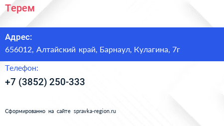 Терем по адресу 656012, Алтайский край, Барнаул, Кулагина, 7г в дальнейшем Организация, размещена в следующих категориях: