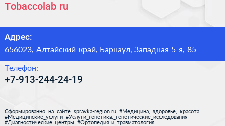 Tobaccolab.ru по адресу 656023, Алтайский край, Барнаул, Западная 5-я, 85 в дальнейшем Организация, размещена в следующих категориях: