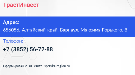 ТрастИнвест по адресу 656056, Алтайский край, Барнаул, Максима Горького, 8 в дальнейшем Организация, размещена в следующих категориях: