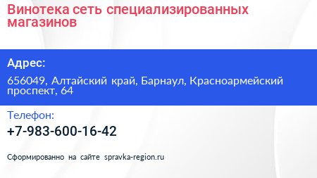 Винотека, сеть специализированных магазинов по адресу 656049, Алтайский край, Барнаул, Красноармейский проспект, 64 в дальнейшем Организация, размещена в следующих категориях:
