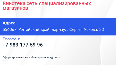 Винотека, сеть специализированных магазинов по адресу 656067, Алтайский край, Барнаул, Сергея Ускова, 23 в дальнейшем Организация, размещена в следующих категориях: