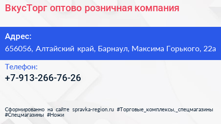 ВкусТорг, оптово-розничная компания по адресу 656056, Алтайский край, Барнаул, Максима Горького, 22а в дальнейшем Организация, размещена в следующих категориях: