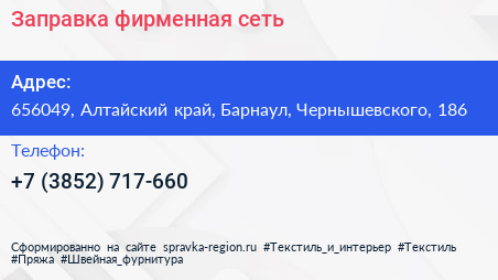 Заправка, фирменная сеть по адресу 656049, Алтайский край, Барнаул, Чернышевского, 186 в дальнейшем Организация, размещена в следующих категориях: