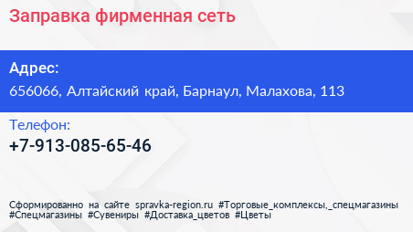 Заправка, фирменная сеть по адресу 656066, Алтайский край, Барнаул, Малахова, 113 в дальнейшем Организация, размещена в следующих категориях: