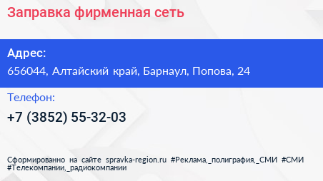 Заправка, фирменная сеть по адресу 656044, Алтайский край, Барнаул, Попова, 24 в дальнейшем Организация, размещена в следующих категориях: