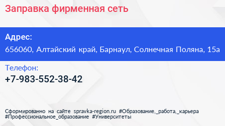 Заправка, фирменная сеть по адресу 656060, Алтайский край, Барнаул, Солнечная Поляна, 15а в дальнейшем Организация, размещена в следующих категориях: