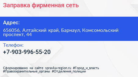 Заправка, фирменная сеть по адресу 656056, Алтайский край, Барнаул, Комсомольский проспект, 44 в дальнейшем Организация, размещена в следующих категориях: