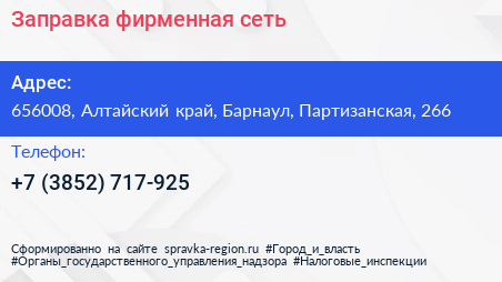 Заправка, фирменная сеть по адресу 656008, Алтайский край, Барнаул, Партизанская, 266 в дальнейшем Организация, размещена в следующих категориях: