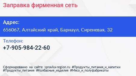 Заправка, фирменная сеть по адресу 656067, Алтайский край, Барнаул, Сиреневая, 32 в дальнейшем Организация, размещена в следующих категориях: