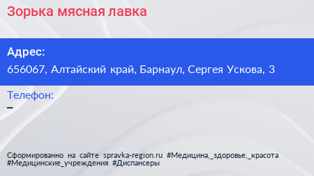 Зорька, мясная лавка по адресу 656067, Алтайский край, Барнаул, Сергея Ускова, 3 в дальнейшем Организация, размещена в следующих категориях: