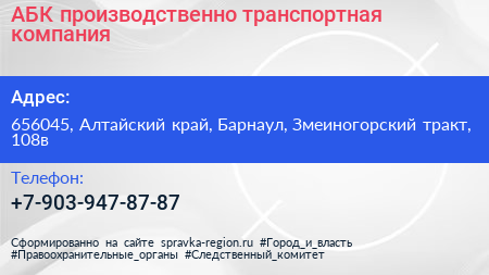 АБК, производственно-транспортная компания по адресу 656045, Алтайский край, Барнаул, Змеиногорский тракт, 108в в дальнейшем Организация, размещена в следующих категориях: