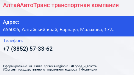 АлтайАвтоТранс, транспортная компания по адресу 656006, Алтайский край, Барнаул, Малахова, 177а в дальнейшем Организация, размещена в следующих категориях: