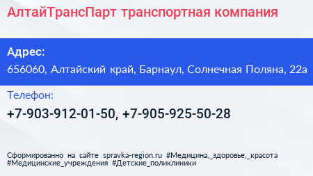 АлтайТрансПарт, транспортная компания по адресу 656060, Алтайский край, Барнаул, Солнечная Поляна, 22а в дальнейшем Организация, размещена в следующих категориях: