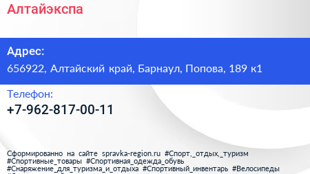 Алтайэкспа по адресу 656922, Алтайский край, Барнаул, Попова, 189 к1 в дальнейшем Организация, размещена в следующих категориях: