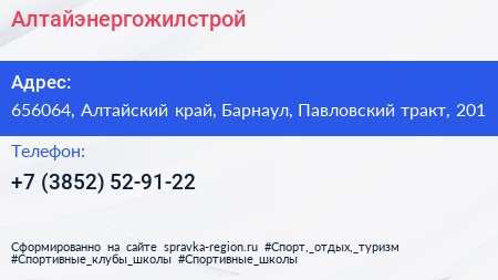 Алтайэнергожилстрой по адресу 656064, Алтайский край, Барнаул, Павловский тракт, 201 в дальнейшем Организация, размещена в следующих категориях: