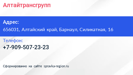 Алтайтрансгрупп по адресу 656031, Алтайский край, Барнаул, Силикатная, 16 в дальнейшем Организация, размещена в следующих категориях: