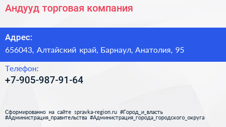 Андууд, торговая компания по адресу 656043, Алтайский край, Барнаул, Анатолия, 95 в дальнейшем Организация, размещена в следующих категориях: