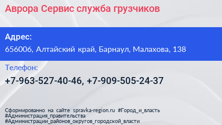 Аврора Сервис, служба грузчиков по адресу 656006, Алтайский край, Барнаул, Малахова, 138 в дальнейшем Организация, размещена в следующих категориях: