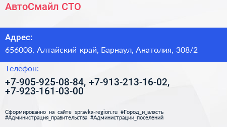 АвтоСмайл, СТО по адресу 656008, Алтайский край, Барнаул, Анатолия, 308/2 в дальнейшем Организация, размещена в следующих категориях: