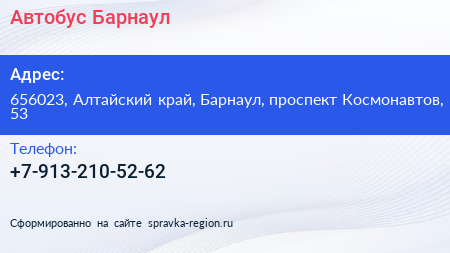 Автобус-Барнаул по адресу 656023, Алтайский край, Барнаул, проспект Космонавтов, 53 в дальнейшем Организация, размещена в следующих категориях: