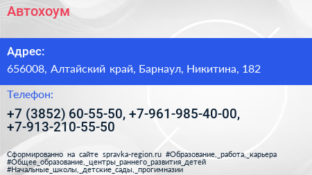 Автохоум по адресу 656008, Алтайский край, Барнаул, Никитина, 182 в дальнейшем Организация, размещена в следующих категориях: