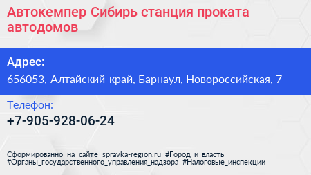 Автокемпер Сибирь, станция проката автодомов по адресу 656053, Алтайский край, Барнаул, Новороссийская, 7 в дальнейшем Организация, размещена в следующих категориях: