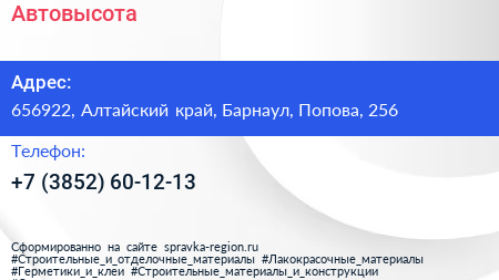 Автовысота по адресу 656922, Алтайский край, Барнаул, Попова, 256 в дальнейшем Организация, размещена в следующих категориях: