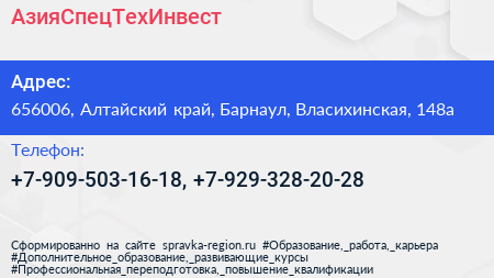 АзияСпецТехИнвест по адресу 656006, Алтайский край, Барнаул, Власихинская, 148а в дальнейшем Организация, размещена в следующих категориях: