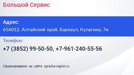 Большой-Сервис по адресу 656012, Алтайский край, Барнаул, Кулагина, 7и в дальнейшем Организация, размещена в следующих категориях: