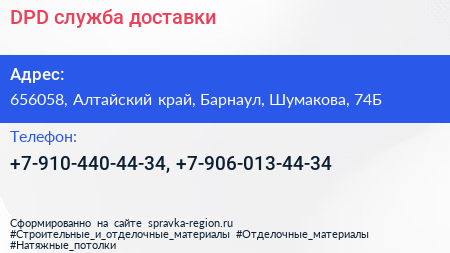 DPD, служба доставки по адресу 656058, Алтайский край, Барнаул, Шумакова, 74Б в дальнейшем Организация, размещена в следующих категориях: