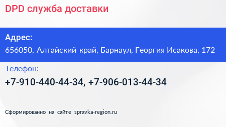 DPD, служба доставки по адресу 656050, Алтайский край, Барнаул, Георгия Исакова, 172 в дальнейшем Организация, размещена в следующих категориях: