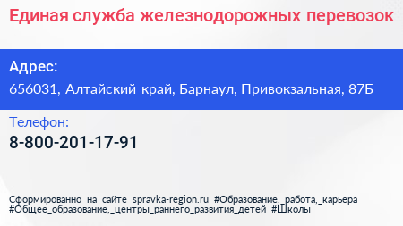 Единая служба железнодорожных перевозок по адресу 656031, Алтайский край, Барнаул, Привокзальная, 87Б в дальнейшем Организация, размещена в следующих категориях: