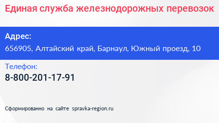Единая служба железнодорожных перевозок по адресу 656905, Алтайский край, Барнаул, Южный проезд, 10 в дальнейшем Организация, размещена в следующих категориях: