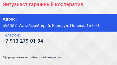 Энтузиаст, гаражный кооператив по адресу 656067, Алтайский край, Барнаул, Попова, 167е/1 в дальнейшем Организация, размещена в следующих категориях: