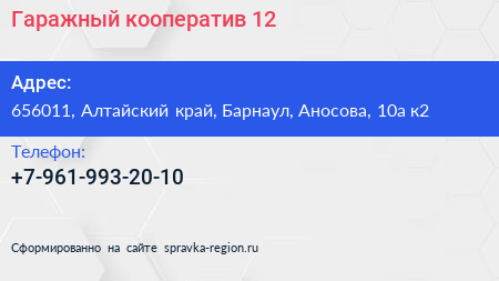 Гаражный кооператив №12 по адресу 656011, Алтайский край, Барнаул, Аносова, 10а к2 в дальнейшем Организация, размещена в следующих категориях: