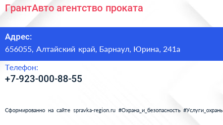 ГрантАвто, агентство проката по адресу 656055, Алтайский край, Барнаул, Юрина, 241а в дальнейшем Организация, размещена в следующих категориях: