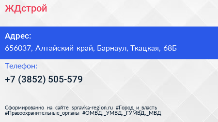 ЖДстрой по адресу 656037, Алтайский край, Барнаул, Ткацкая, 68Б в дальнейшем Организация, размещена в следующих категориях: